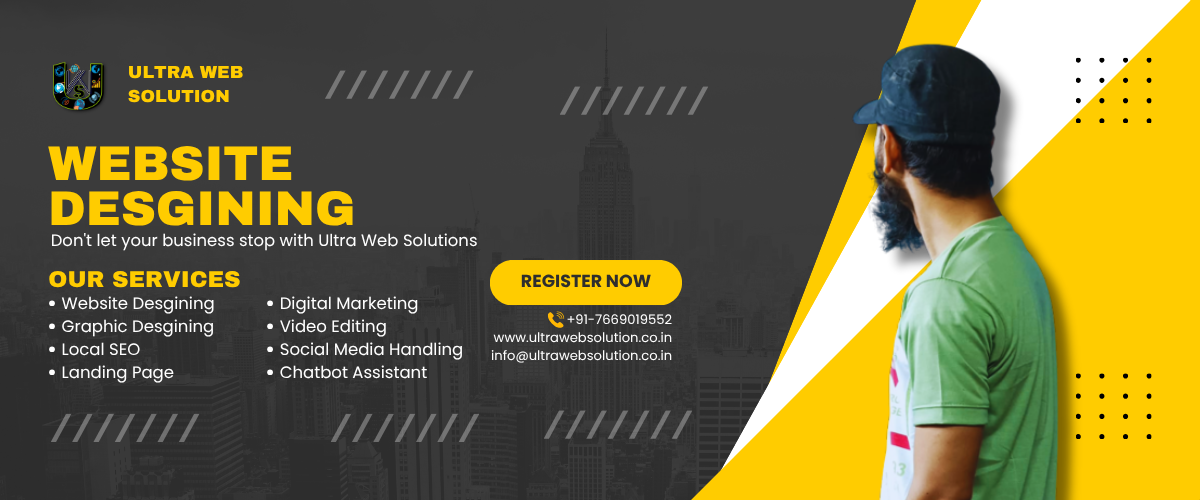 Web Designing, Graphic Designing, Digital Marketing, Landing Page Designing, Video Editing, Local SEO, Social Media Handling, AI Technology, Facebook Advertisement, Chatbots Services – all by Ultra Web Solution.